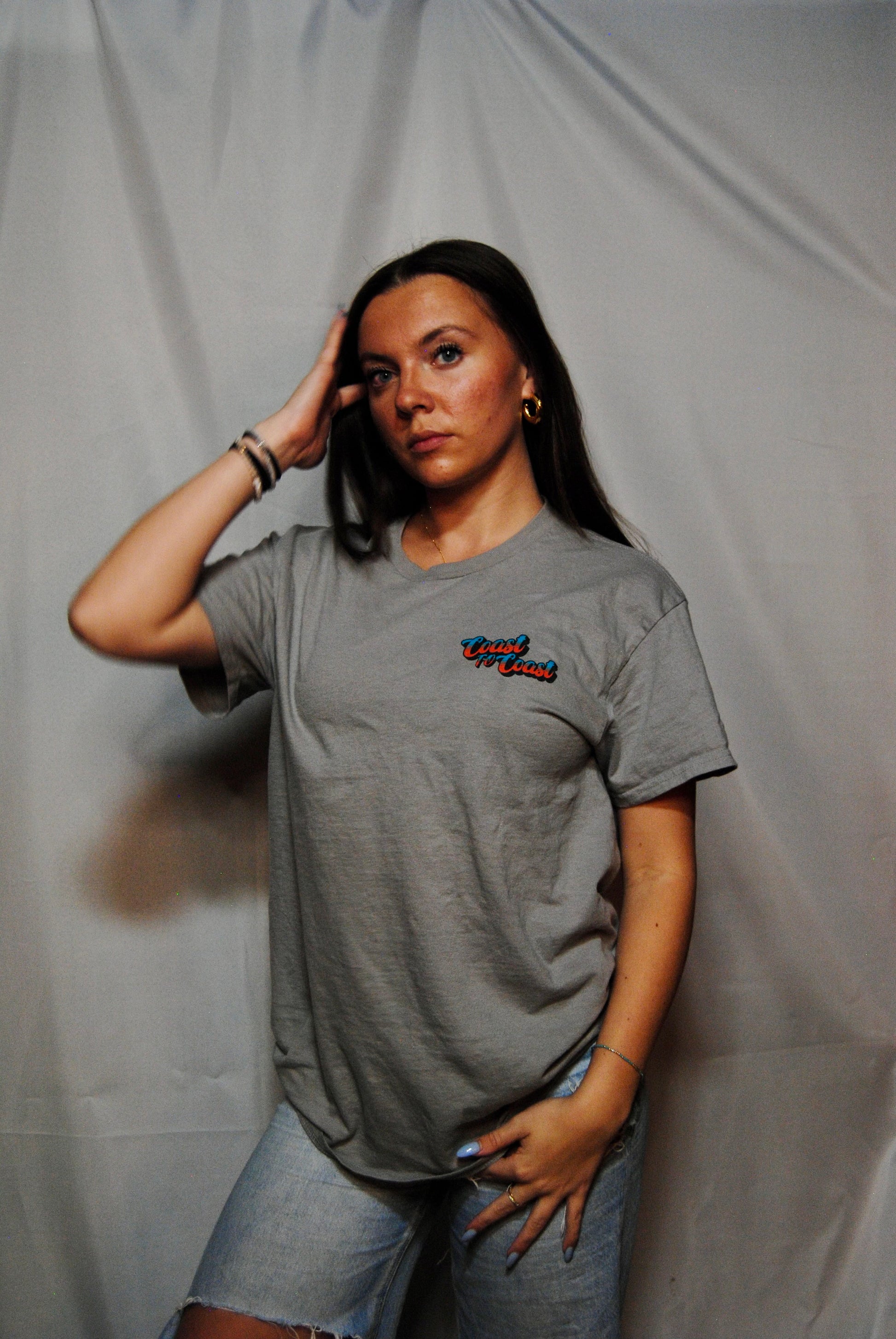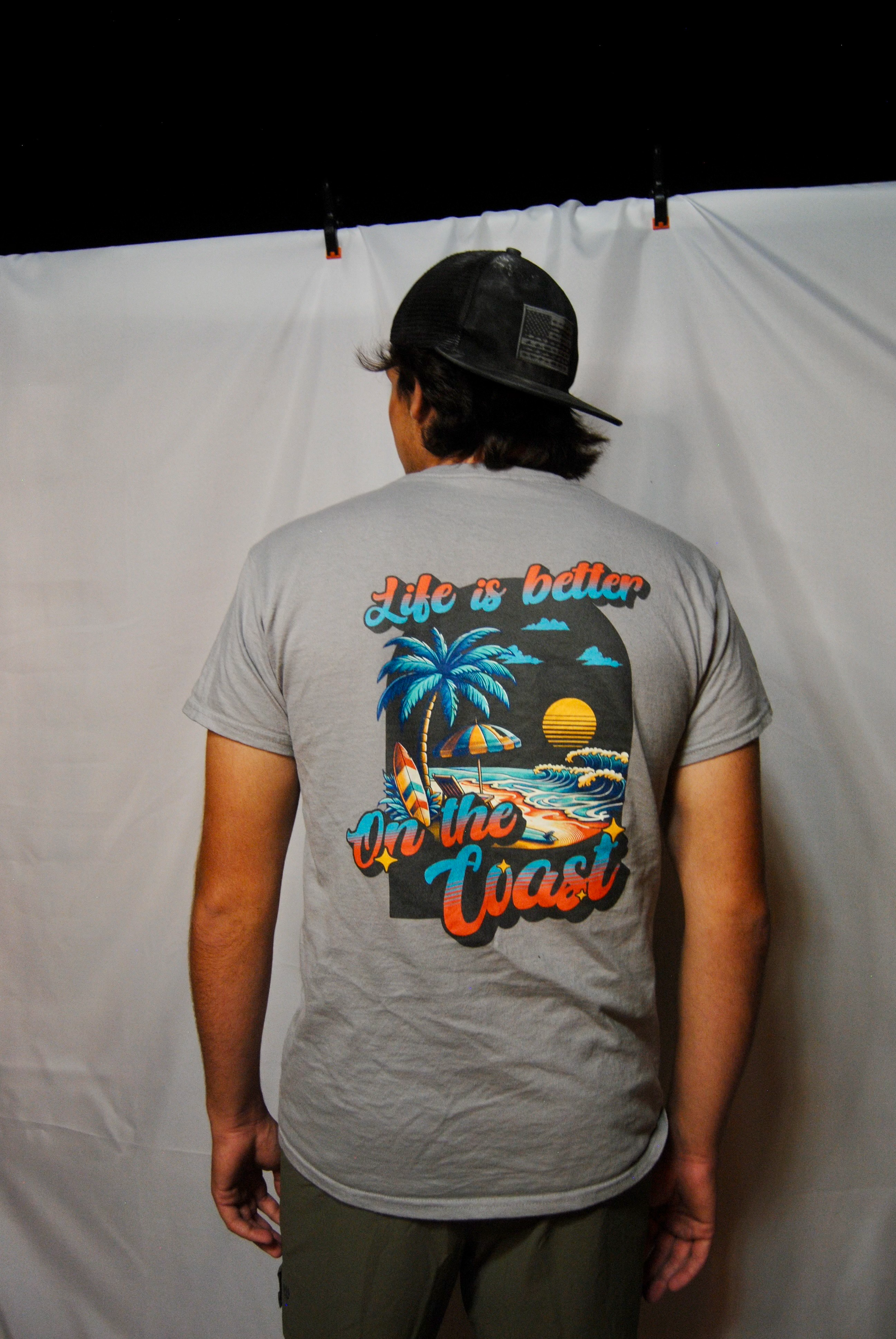 Relax in style with this light grey 100% cotton tee, featuring a serene night beach scene with a palm tree and lounge chair. Finished with the words "Life is better on the coast," it's perfect for dreamers and beach lovers alike.